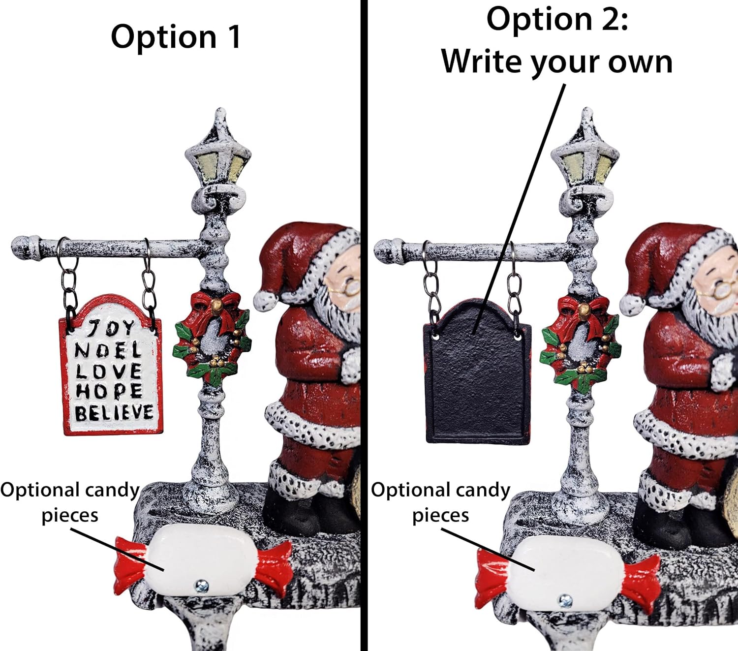 - Cast Iron Village Stocking Holder, unique design with a 3D Christmas tree, glowing house with gleeful children and their pet dog, rein deer and a busy santa with his list of gifts and blessings and a very merry snowman with candy cane hooks where u can easily scroll your name with your favorite color marker, tall lamp posts on each side add the perfect start and end to this stocking holder